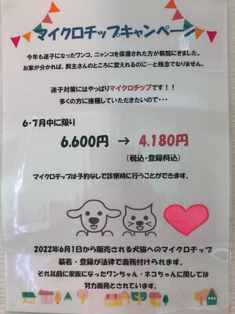 より多くの方にマイクロチップの装着をして頂きたいので「マイクロチップキャンペーン」を行います。7月末までのキャンペーンでしたが、好評につき8月末まで延長いたします!