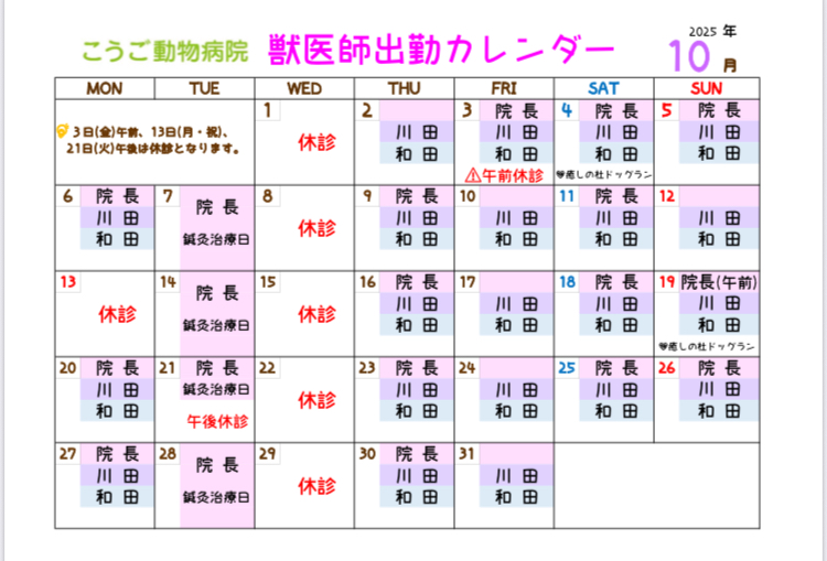 10月の獣医師出勤カレンダーです。