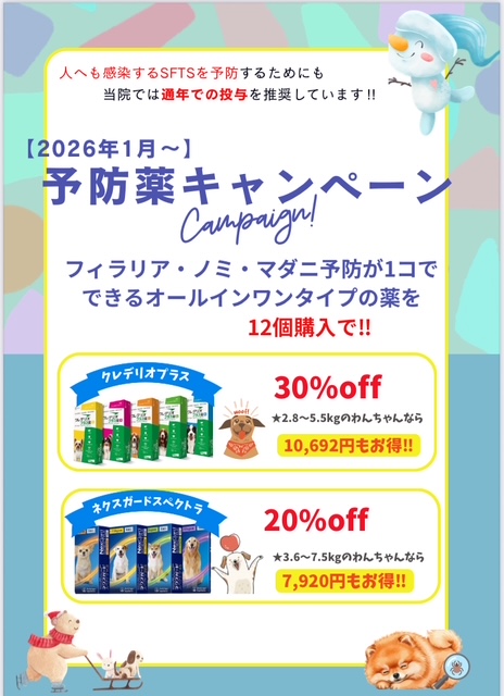 マダニは1月、2月でも発生しています。SFTS予防のためにもマダニの通年予防をおススメしています。